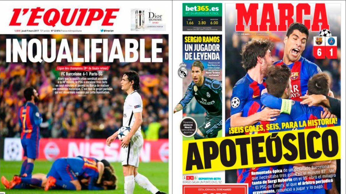 "Remontada épica de un Barcelona que necesitaba tres goles en el minuto 87", describió el periódico Marca, que tituló: "Apoteósico".