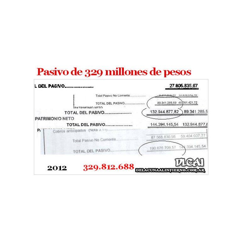 En el caso de Racing, la directiva que encabeza Gastón Cogorno explicó el lado positivo del balance: por primera vez podrían concretar un déficit cero en el próximo ejercicio o con un máximo de 7.000.000 de pesos, fácilmente equilibrable con una transferencia importante de algún jugador. En el caso de Estudiantes de La Plata, los números que se dieron a conocer en la última asamblea marcan un pasivo de 109.600.000 pesos, que casi se triplicó en un año cuando rondaba los 40.000.000 de pesos. Lo llamativo es que el club albirrojo fue campeón de la Libertadores en 2009 (jugó el Mundial de Clubes de ése año) y campeón del Apertura 2010, por lo que no le faltaron buenos ingresos económicos y cotización de su plantel. Según el detalle de las cuentas, lo más preocupante es el déficit operativo mensual del club, que ronda los 3.800.000 pesos. Marchan a la cabeza De acuerdo a los números que muestran sus balances, Independiente, San Lorenzo y River siguen estando a la cabeza en la “tabla de posiciones” de los pasivos más preocupantes. Como quedó dicho, la administración de Javier Cantero en Independiente lucha ahora con un pasivo de casi 330.000.000 de pesos productos de serias falencias en la administración anterior. En el caso de San Lorenzo, este año los avatares políticos (la salida antes de tiempo de Carlos Abdo con el nuevo llamado a elecciones y la agónica salvación del descenso) postergaron la memoria y balance del último ejercicio. No obstante, antes de dejar la presidencia Carlos Abdo admitió que el pasivo rondaba los 134.000.000 de pesos. En River, en tanto, las millonarias transferencias de Erik Lamela y Lucas Ocampos, más otros ajustes de gastos, permitieron a la administración de Daniel Passarella bajar el pasivo -dicen en el club- de unos 200 millones de pesos a los 120 millones que arrojaría el último ejercicio que se espera salga a la cancha en cualquier momento.