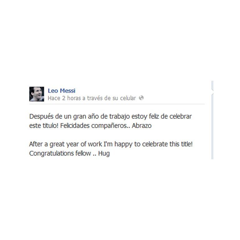 El astro Lionel Messi expresó hoy, a través de la red social Facebook, su alegría tras enterarse de la obtención del título de la Liga Española de su equipo Barcelona, un día antes de enfrentar a Atlético de Madrid.