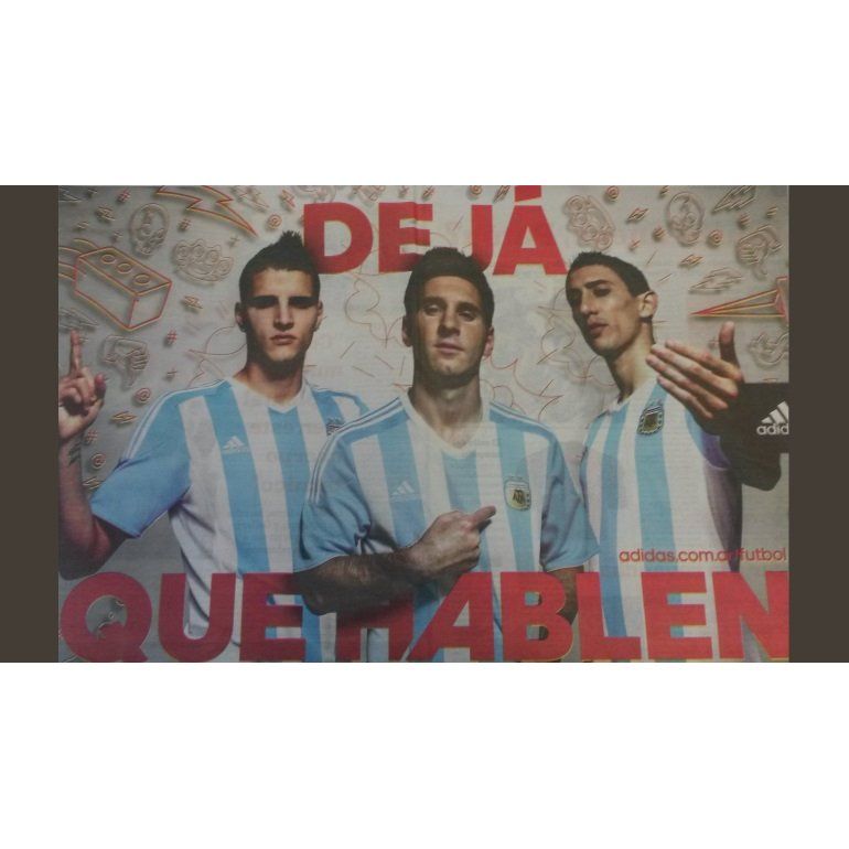 En el afiche que presentó la marca, se los ve a Lionel Messi, Ángel Di María y Erik Lamela, juntos, vistiendo la nueva camiseta. La casaca, con un esquema parecido a la del Mundial, saca las tiras negras del cuello y las mangas y utiliza el celeste en la terminación de los bastones horizontales.