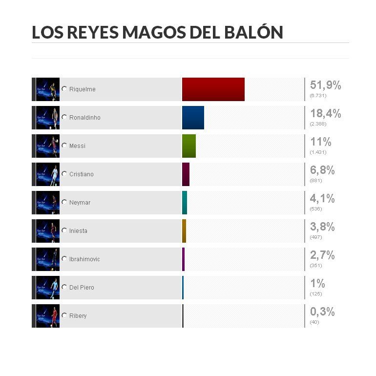 Los años pasan, pero la magia sobrevive en las imágenes grabadas y en la memoria de los gustosos del buen fútbol. Esa parece ser la lógica de los lectores del diario español Marca, que en una encuesta entre varios de los mejores jugadores del mundo, eligieron a Juan Román Riquelme como "El Rey Mago del Balón".