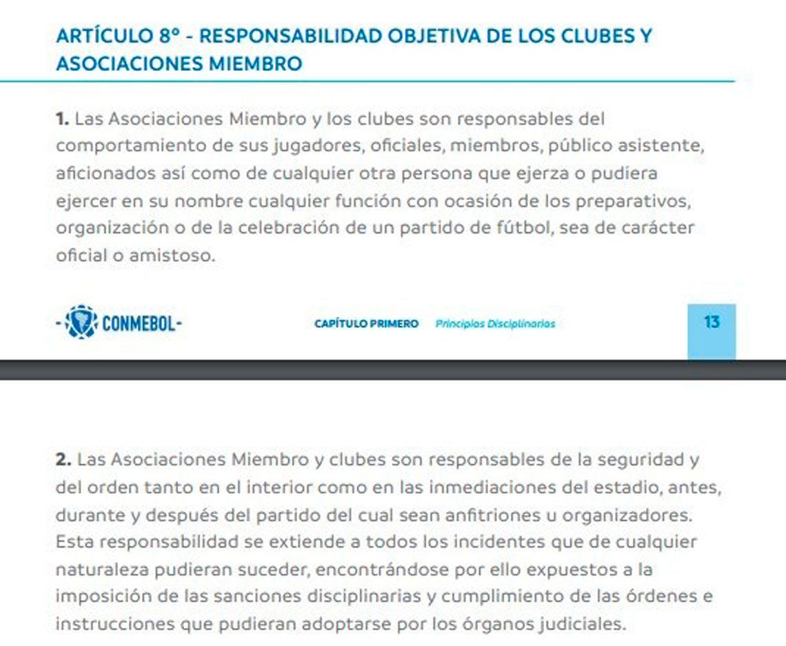 Esto dice el reglamento de la Conmebol cuando ocurren incidentes en las adyacencias del estadio: "El club local es responsable del orden tanto en el estadio como en las inmediaciones", marca el artículo 8.