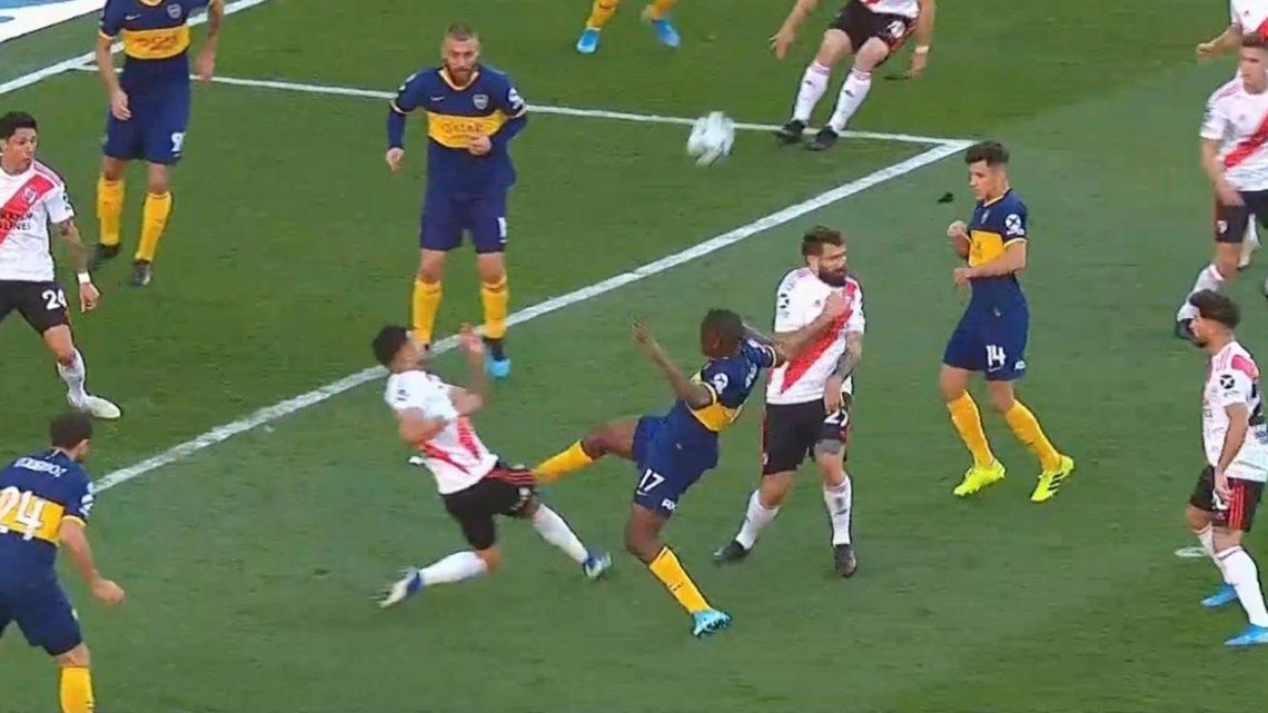 Promediaba el primer tiempo en el Superclásico entre River y Boca en el Monumental, y las piernas bruscas y las faltas fuertes no se querían quedar afuera del duelo liguero. Patada va, patada viene y varias amonestaciones se hicieron presentes por parte de Fernando Rapallini.