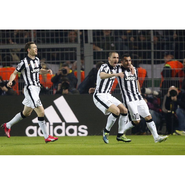 El delantero argentino Carlos Tevez convirtió dos de los tres goles con los que Juventus de Italia goleó hoy a Borussia Dortmund por 3-0, en Alemania, y avanzó a los cuartos de final de la Liga de Campeones de Europa de fútbol, tras redondear un global de 5-1.