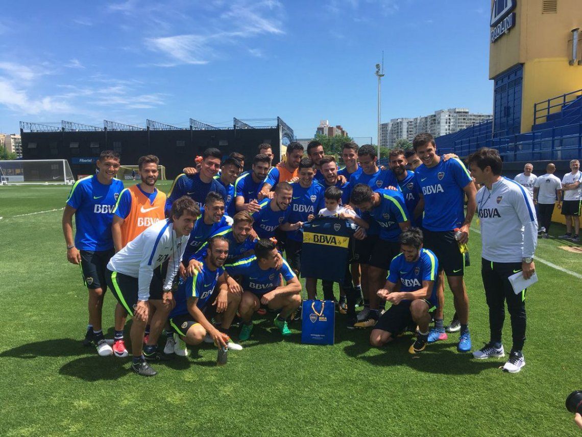 Primero recibió el abrazo de todos, luego le entregaron una camiseta firmada por el plantel, se sacaron una foto grupal; luego Thiago se puso la casaca de sus sueños e inmortalizó ese momento con otra foto con Guillermo y Gustavo Barros Schelotto.