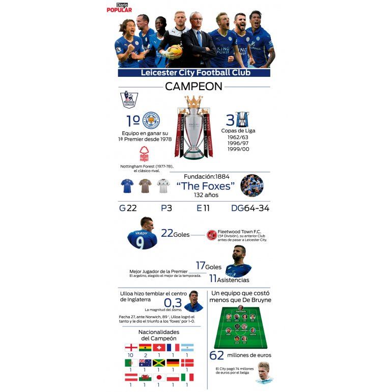 Números, curiosidades y datos imperdibles del equipo inglés, que acaba de obtener un logro inolvidable al ganar la Premier League 2015/16 en el fútbol inglés. Embed Embed Embed