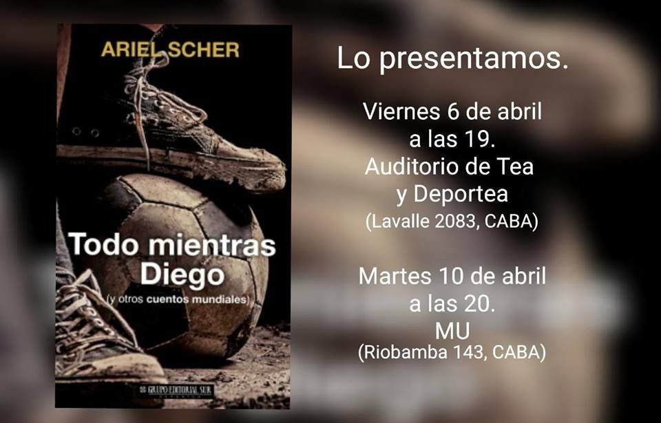 Como para corroborar que los mundiales de fútbol son uno de los grandes relatos de nuestras vidas, Ariel Scher acaba de sacar el libro "Todo mientras Diego (y otros cuentos mundiales)", un libro que reúne sus ficciones alrededor de la gran cita que el fútbol y la vida proponen cada cuatro años. La obra tiene dos presentaciones iniciales: el viernes 6 de abril, a las 19, en TEA y DeporTea (Lavalle 2083) y el martes 10 de abril, a las 20 en La Vaca-Mu (Riobamba 143).