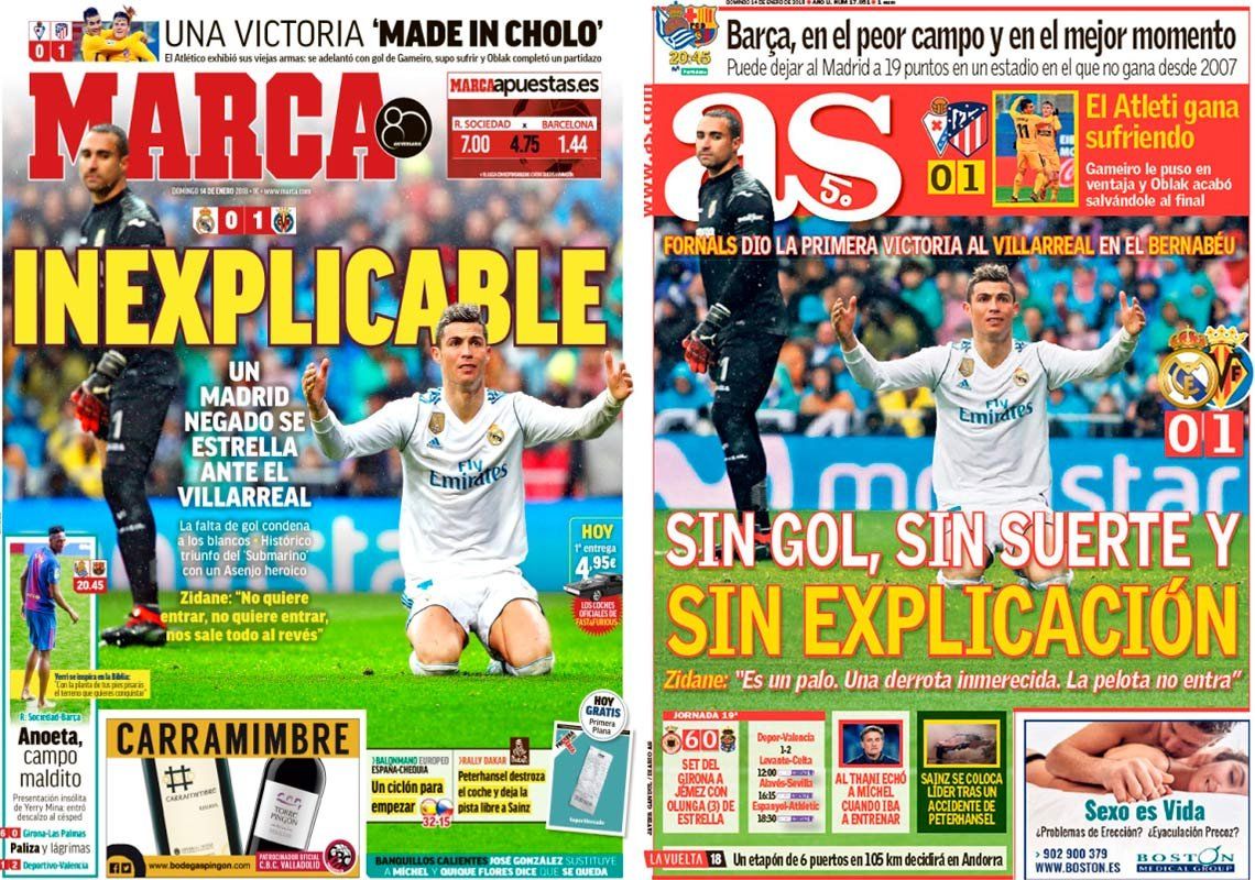 "El Madrid no detiene su derrumbe", tituló el diario deportivo Marca, que calificó de "Expediente X" lo que le ocurre a un Real Madrid que "no se explica lo que le está pasando" en la Liga.