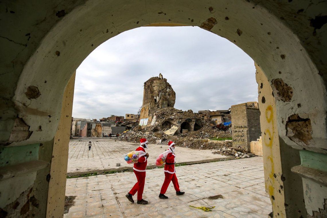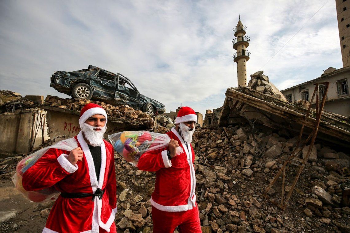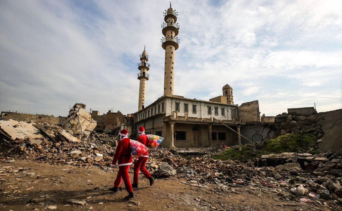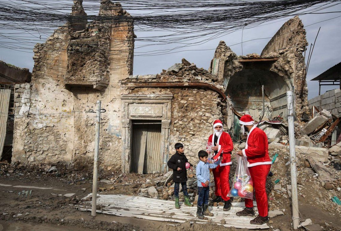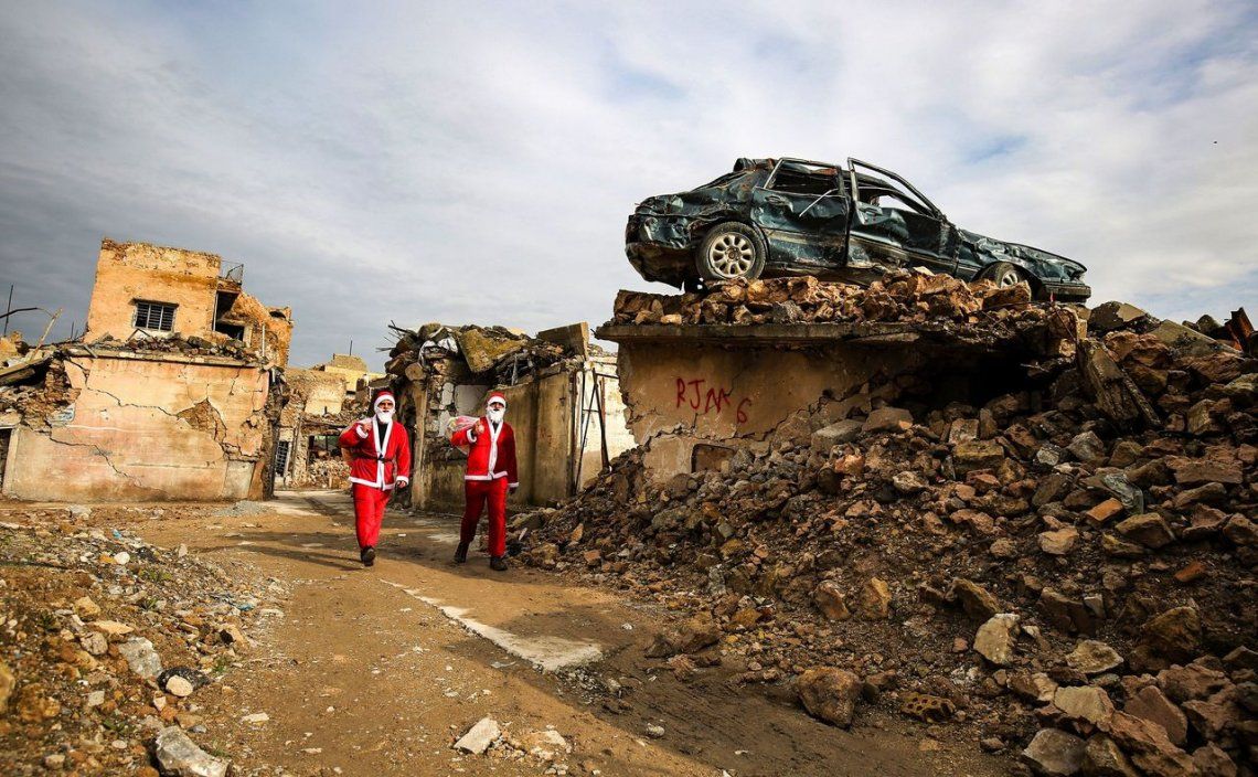 Dos Papá Noel iraquíes regalaron juguetes en las ruinas de Mosul