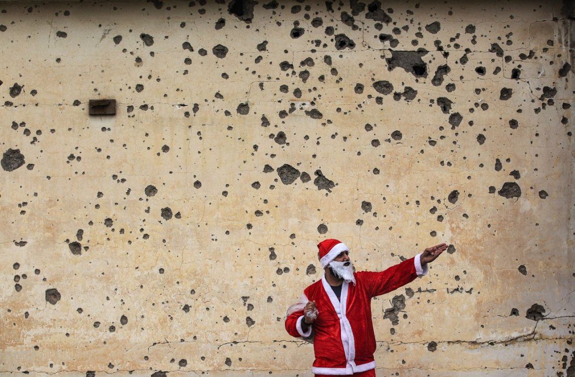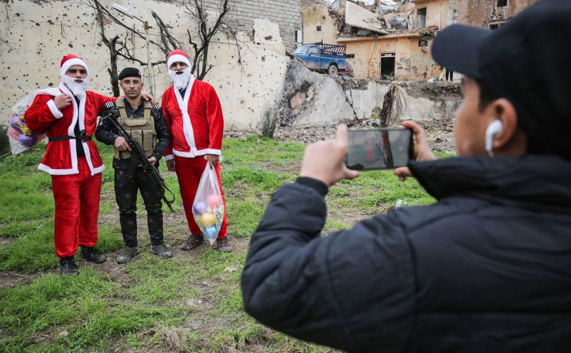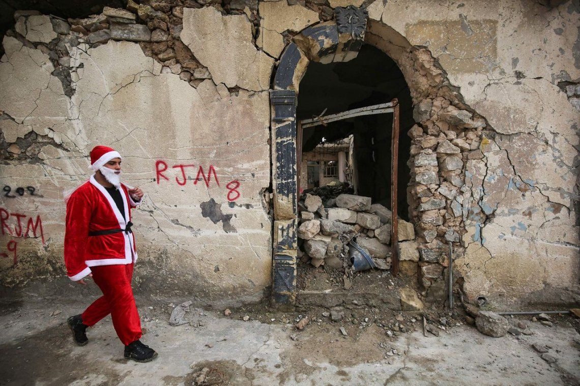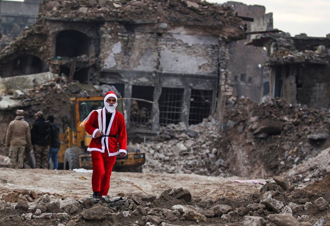 Dos Papá Noel iraquíes regalaron juguetes en las ruinas de Mosul