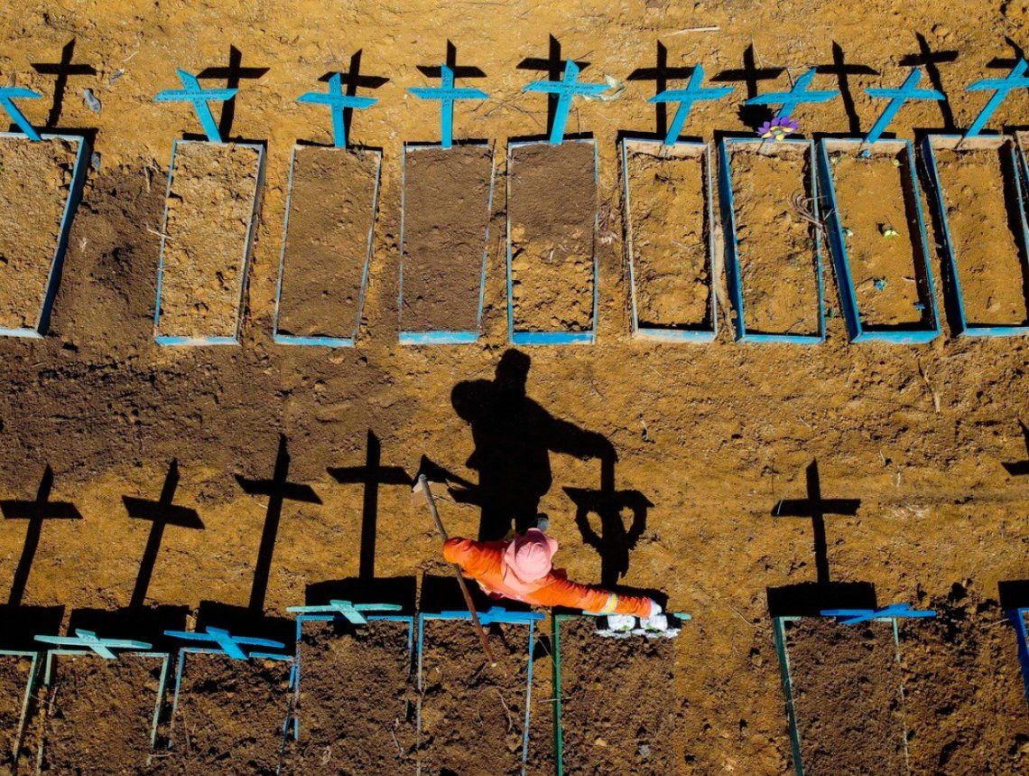 Padre e hija, fanáticos de Diego Maradona, lloran mientras se reúnen junto al Obelisco para rendir homenaje el día de su muerte en Buenos Aires, noviembre de 2020. Foto: RONALDO SCHEMIDT / AFP Un hospital de San Pablo. Trabajadores con máscaras se dirigen al trabajo durante la hora pico de la mañana en la estación de tren de Shinagawa en Tokio, febrero de 2020. -Foto: CHARLY TRIBALLEAU / AFP Una enfermera con máscara protectora y equipo consuela a otra mientras cambian de turno en el hospital de Cremona, al sureste de Milán, marzo de 2020. Foto: Paolo MIRANDA / AFP Un helicóptero sobrevuela un mural de Kobe Bryant en el centro de Los Ángeles, enero de 2020. Foto: Apu GOMES / AFP Una mujer lleva una botella de agua de plástico con un recorte para cubrirse la cara, mientras camina sobre una pasarela en Hong Kong como medida preventiva tras un brote de virus, enero de 2020. Foto: Anthony WALLACE / AFP Un gato mira hacia abajo a un soldado ucraniano que descansa en una trinchera en la línea del frente con separatistas respaldados por Rusia cerca de la aldea de Krasnogorivka, región de Donetsk. Foto: Anatolii STEPANOV / AFP Gonzaga Yiga, hace un llamamiento a los residentes a través de un orador del edificio más alto del área por la mañana y por la noche, sobre cómo frenar el coronavirus COVID-19, en Kampala, Uganda, marzo de 2020. Foto: Badru KATUMBA / AFP Funcionarios con trajes de protección controlando a un anciano con una máscara facial que se derrumbó y murió en una calle cerca de un hospital en Wuhan, enero 2020. Foto: Hector RETAMAL / AFP Un canguro salta en un campo en medio del humo de un incendio forestal en Snowy Valley en las afueras de Cooma, Australia, enero de 2020. Foto: SAEED KHAN / AFP El presidente de los Estados Unidos, Donald Trump, se retira después de hablar durante la sesión informativa diaria sobre el nuevo coronavirus, en la Sala de Información Brady de la Casa Blanca, abril de 2020. Foto: JIM WATSON / AFP Miembros de las pandillas "Mara 18" y "MS-13" bajo custodia en una prisión de máxima seguridad en Izalco, Sonsonate, El Salvador, septiembre de 2020, en medio de la nueva pandemia de coronavirus. Foto: Yuri CORTEZ / AFP Los estudiantes almuerzan en escritorios con tabiques de plástico como medida preventiva para frenar la propagación del coronavirus COVID-19 en la escuela primaria Dajia en Taipei, abril de 2020. Foto: Sam Yeh / AFP Personas practicando el distanciamiento social en círculos blancos en Domino Park, en la ciudad de Nueva York durante la pandemia de Covid-19, mayo de 2020. Foto: Johannes EISELE / AFP Un joven que vive al pie del volcán Taal monta una canoa mientras el volcán arroja ceniza desde la ciudad de Tanauan en la provincia de Batangas, al sur de Manila, enero de 2020. Foto: Ted ALJIBE / AFP Un manifestante reacciona parado frente a un edificio en llamas incendiado durante una manifestación en Minneapolis, Minnesota, por la muerte de George Floyd, un hombre negro que murió después de que un policía se arrodillara sobre su cuello, mayo de 2 Sepulturero en el cementerio de Nossa Senhora donde diariamente se entierran víctimas del COVID-19, en el barrio de Taruma, en Manaus, Brasil. Foto: Michael DANTAS / AFP Una pareja almuerza bajo la protección en un restaurante en París, mayo de 2020. Foto: ALAIN JOCARD / AFP Un habitante de una residencia compuesta por 226 viviendas en su mayoría insalubres, recoge los alimentos ofrecidos por los vecinos desde su balcón, utilizando una cuerda hecha con mantas, en Marsella, sur de Francia, marzo de 2020, en Marsella, sur de Un comprador con una mascara protectora clasifica los artículos en su carrito mientras está de pie junto a los estantes vacíos de los supermercados, generalmente llenos de papel higiénico y rollos de cocina, en Hong Kong, febrero de 2020. Foto: Philip