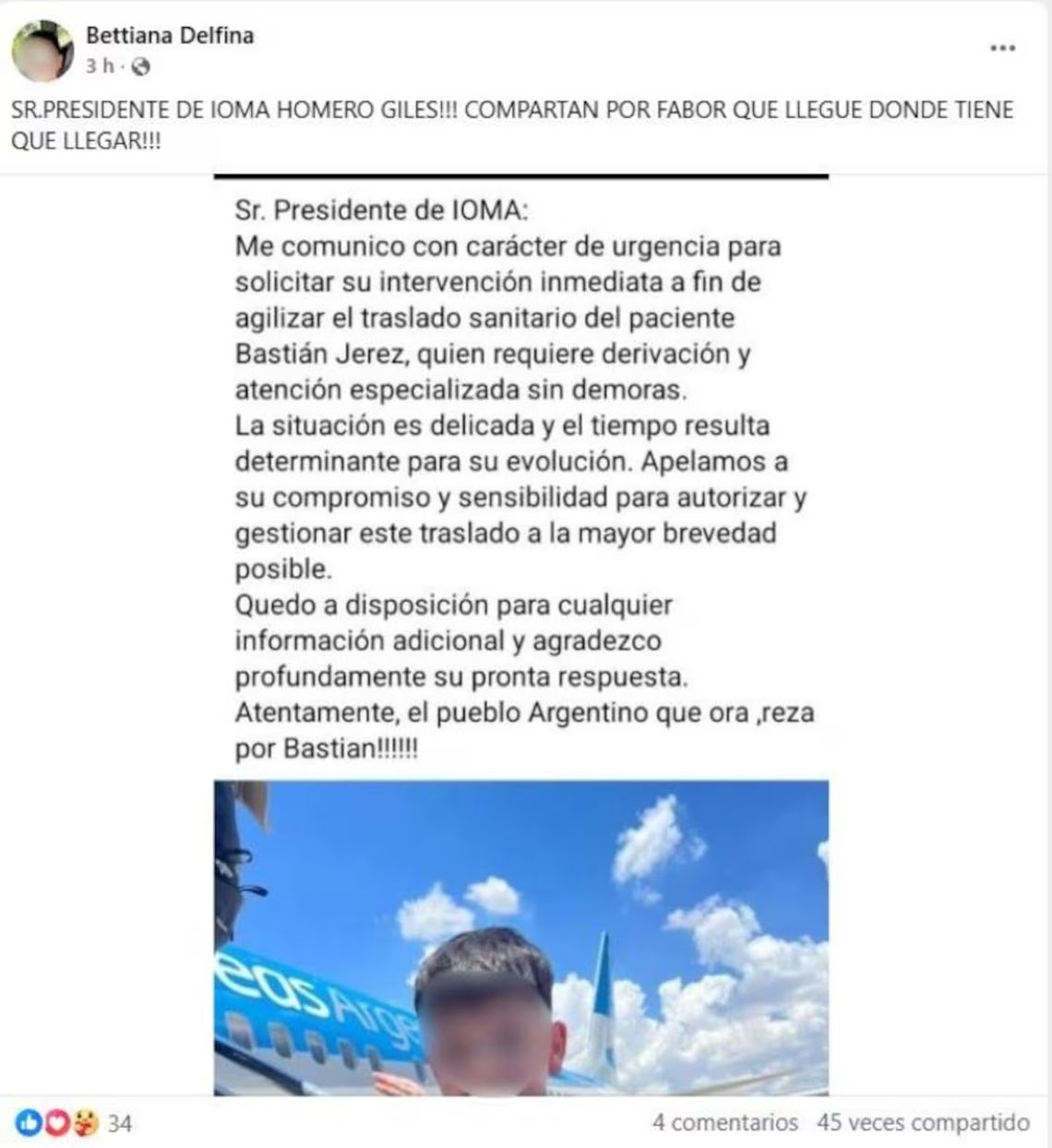 “Sr. Presidente de IOMA, me comunico con carácter de urgencia para solicitar su intervencion inmediata a fin de agilizar el traslado sanitario del paciente Bastian Jerez”, compartió la mujer en un posteo. El nene de 8 años requiere de “derivación y atención especializada sin demoras”, agregó.