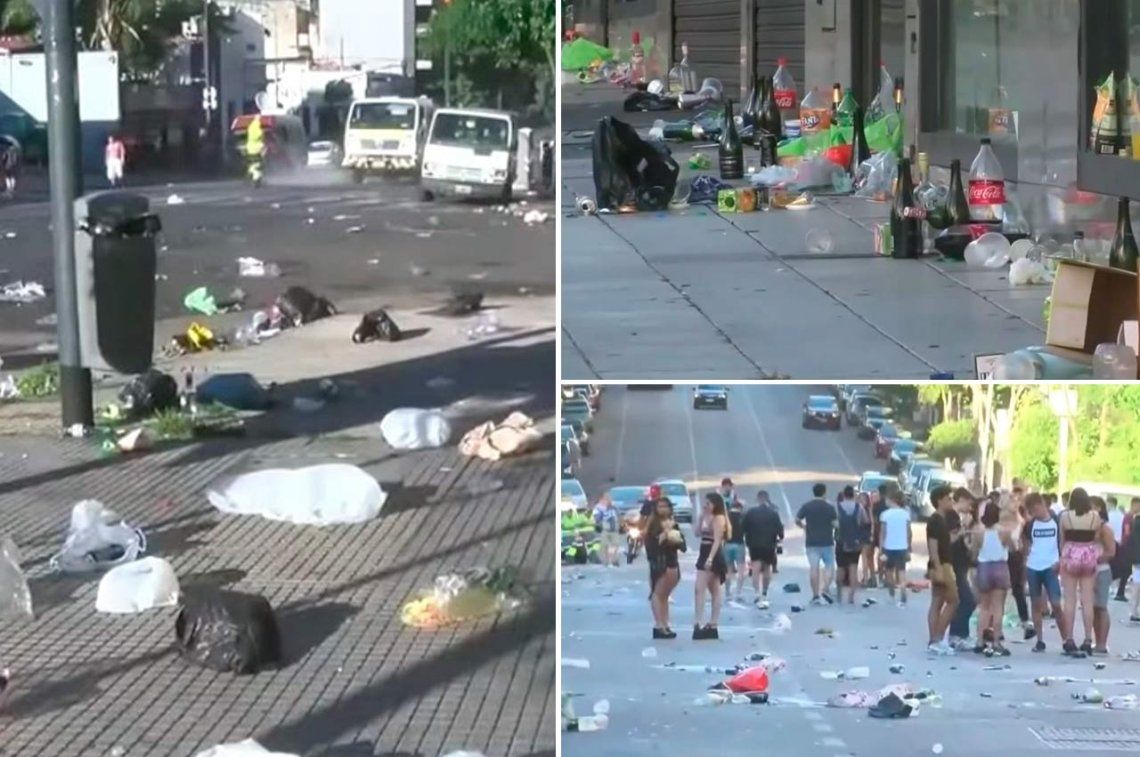 Botellas de vidrio y plástico, vasos de todos tamaños y colores, y bolsas, ocupaban las veredas y la calzada, impidiendo inclusive la libre circulación de los vehículos, que debían desviarse ya que móviles de la policía impedían el paso, al tiempo que actuaban como “valla de contención”.