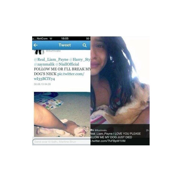 Una adolescente le escribió un mensaje vía Twitter a todos los integrantes de la banda One Direction para que la sigan en esa red social, y los amenazó con "romperle el cuello" a su propio perro si no lo hacían.