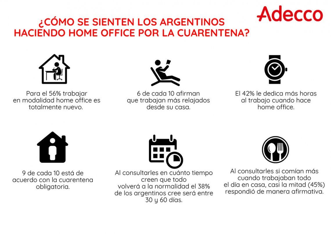 Según los datos obtenidos por Adecco, el 42% le dedica más horas al trabajo desde su hogar que en la oficina, mientras que un 40% cumple exactamente la carga horaria habitual. Sólo el 18% admite relajarse y trabajar menos.