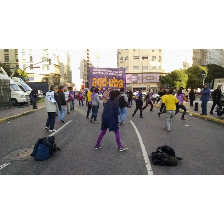 El partido estaba pautado para el lunes, pero el clima lo impidió. Así que este martes, docentes de la Asociación Gremial Docente de la UBA y alumnos de la FUBA, se calzaron la camiseta y jugaron un picadito frente al Obelisco.