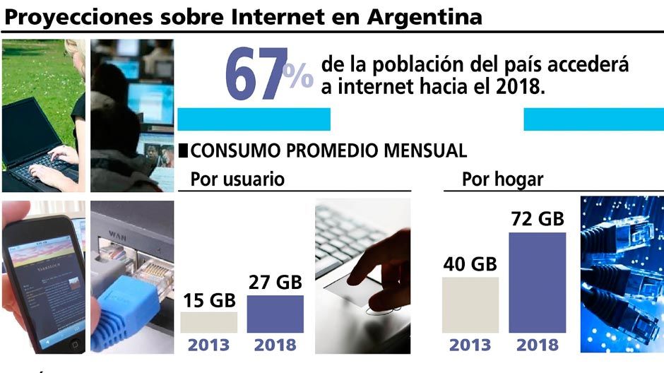 En promedio en el 2013, un usuario de internet de la Argentina consumía por mes 15 gigabytes y la previsión es que se extienda a 27 gigabytes en el año 2018, mientras que en cada hogar el promedio de tráfico de internet alcanzó el promedio de 40 gigabytes el año pasado y la previsión es que subirá hasta 72 gigabytes por mes en el 2018.