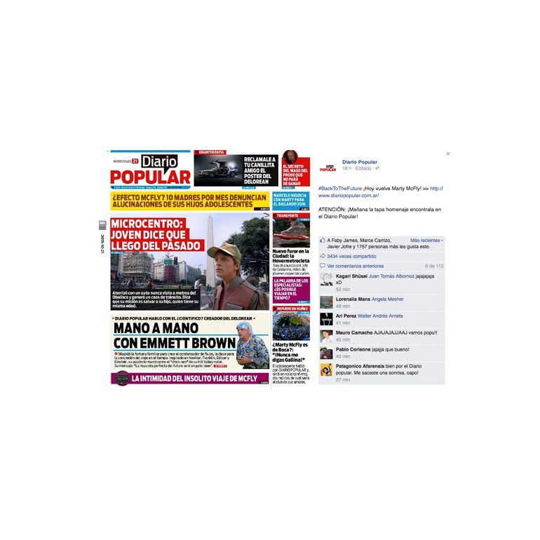 Una idea sobrevoló la redacción días atrás. La masticamos en equipo, maduró algunas horas y finalmente vio la luz hoy. Decía así: Marty McFly llega a nuestro presente y tenemos que contar eso de forma diferente. ¿Por qué no hacemos una tapa "de fantasía" con el arribo del protagonista de Volver al Futuro a Buenos Aires? Y fue así como esa portada de Diario Popular generó en la web un recorrido que ni siquiera nosotros esperábamos. Sí, la sorpresa que teníamos preparada para los fanáticos de esa memorable trilogía ochentosa nos explotó en la cara. Y fue una dulce explosión.