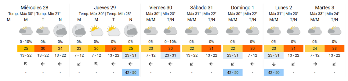 Ya el jueves, el panorama se mantendrá estable, con cielo ligeramente nublado con algunos chaparrones y marcas térmicas que oscilarán entre los 24°C y los 33°C, nuevamente con viento del sureste.