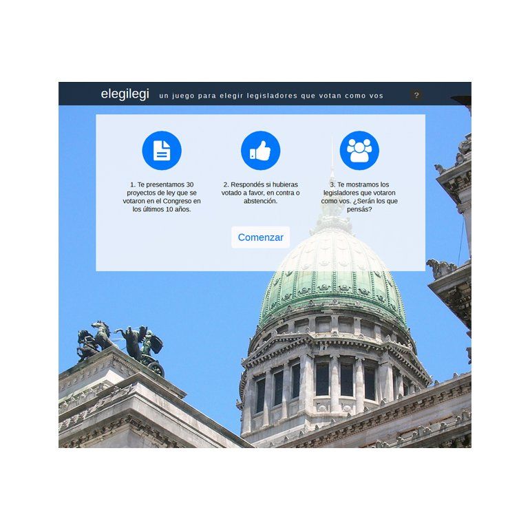 Se trata de la web www.elegilegi.org, una aplicación que propone votar a favor o en contra 30 proyectos de ley que fueron aprobados por el Congreso durante los últimos 10 años, para luego desplegar una lista con los porcentajes de coincidencias y disidencias que hubo con todos los legisladores.