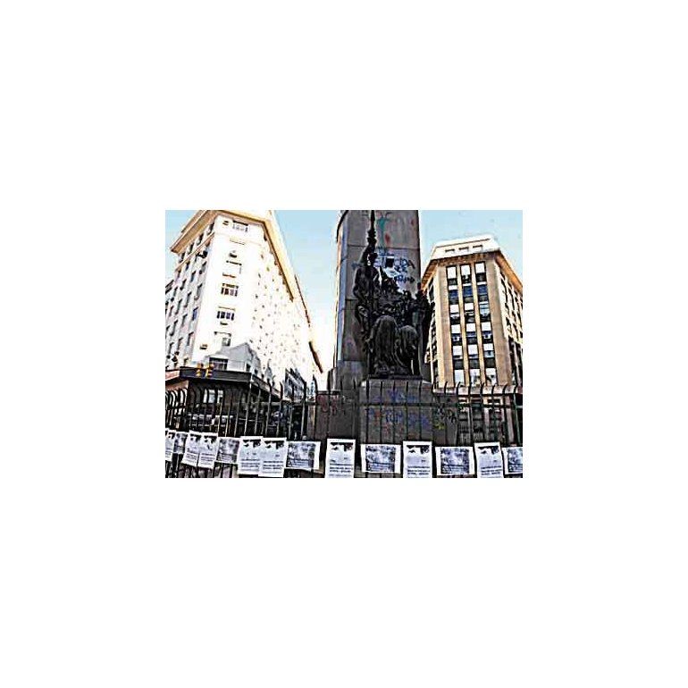 Las rejas perimetrales del imponente monumento servían de instalación a hojas fotocopiadas con la imagen documental de un grupo de caciques, hechos prisioneros por el ejército que comandó la campaña de dominio de las tierras del centro-Sur del territorio argentino, en las que residían decenas de miles de habitantes originarios. El monumento es habitualmente lugar de convocatoria de protestas y contrafestejos en aniversarios como el 12 de Octubre, día de la conquista española de un territorio de ultramar.