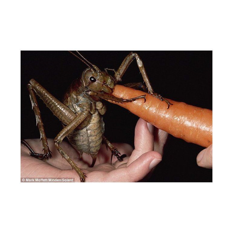 O sea, pesa casi como un pequeño rodeor y es más grande que muchos pájaros. La foto fue tomada por un entomólogo aficionado en la isla Little Barrier, en Nueva Zelanda.
