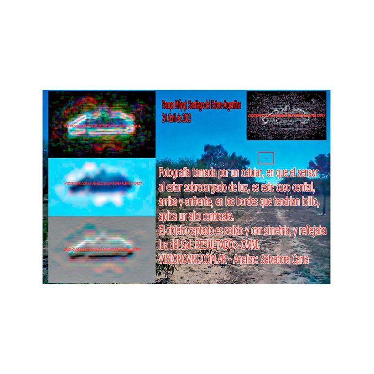 Los profesionales Antonio Pappalardo y Roberto Águila se sorprendieron cuando arribaron a la oficina para revisar las fotografías que componían el trabajo, realizado en plena hora de la siesta. Descubrieron en una de las fotos un objeto en el cielo, hacia el norte, que no se asemejaba a un pájaro ni un avión, sino a un plato hondo, pero al revés. "Vinimos a hacer un relevamiento, y para llevar la información visual y analizarla en la oficina sacamos una serie de fotos. Cerca de las tres de la tarde, sin ver la escena, hice algunas tomas con la cámara (del celular), pero sin ver que hubiera nada extraño. Se las pasé a mi jefe, y él pudo apreciar al verlas en detalle, que había algo raro que aparenta ser un objeto volador no identificado", contó uno de los profesionales a Diario Panorama. La foto fue sacada desde una camioneta en movimiento por el mismo conductor, pasando su celular por encima de su acompañante, quien era su jefe. La misma toma volvió a hacerse una vez que los ingenieros bajaron del vehículo, aunque fue la primera la que captó el objeto, por lo que puede deducirse de que se encontraba en movimiento. "Yo quería ver el trabajo realizado y cuando veo el objeto a la distancia que tenía la forma como de un objeto volador no identificado (Ovni), como un plato volador, no lo podía creer. Con la computadora, usando el zoom la amplié, y se notaba que se trata de un objeto totalmente sólido", explicó el ingenieron que tomó la foto. "Ante la duda de que podía ser por ejemplo una nube, veo la otra foto sacada con un minuto de intervalo, ya no aparecía, lo cual demostraba que no podía tratarse de una nube, porque había desaparecido rápidamente", añadió. Luego de pasarle la fotos a sus superiores y analizar que se trataba de algo anormal, el profesional aseguró que cambió su percepción sobre la existencia de objetos anormales en el cielo. "Hasta ahora, la verdad que nunca había creído, pero viendo esta foto, pareciera que algo hay. Quedamos muy sorprendidos", concluyó.
