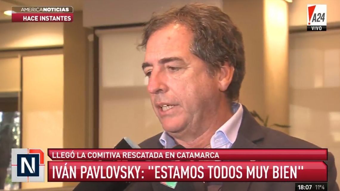 El vocero presidencial Iván Pavlovsky aseguró este sábado a la tarde que "a pesar de que fue una noche muy fría, todos los tripulantes estamos muy bien", al arribar al aeroparque metropolitano de Buenos Aires tras haber pasado la noche en una zona montañosa de Andalgalá, Catamarca, luego de que el helicóptero que trasladaba a varios funcionarios tuvo que descender ayer por las bajas temperaturas.