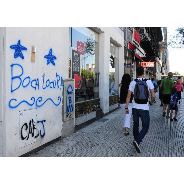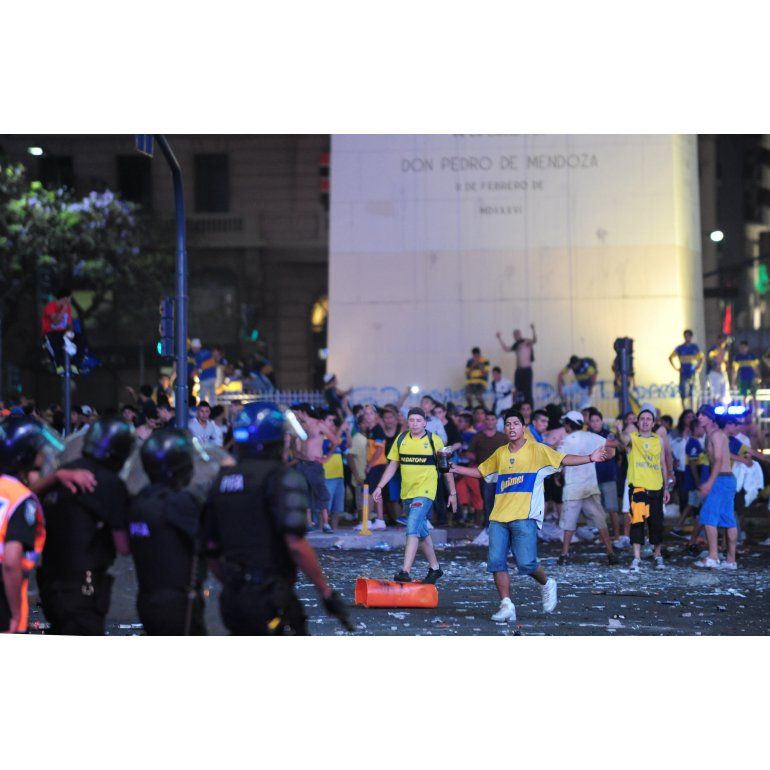Los simpatizantes de Boca que se acercaron al centro porteño a festejar "su" día provocaron serios daños en la bandera argentina del mástil ubicado frente al Obelisco mientras que realizaron pintadas en el monumento nacional.
