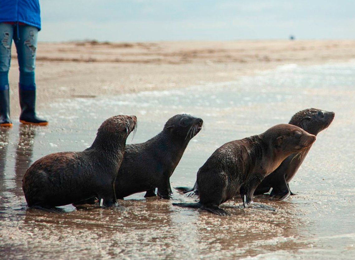 Cuatro lobos marinos que fueron encontrados cuando padecían severos cuadros de desnutrición, regresaron al mar en las playas de San Clemente del Tuyú, luego de ser asistidos por especialistas.