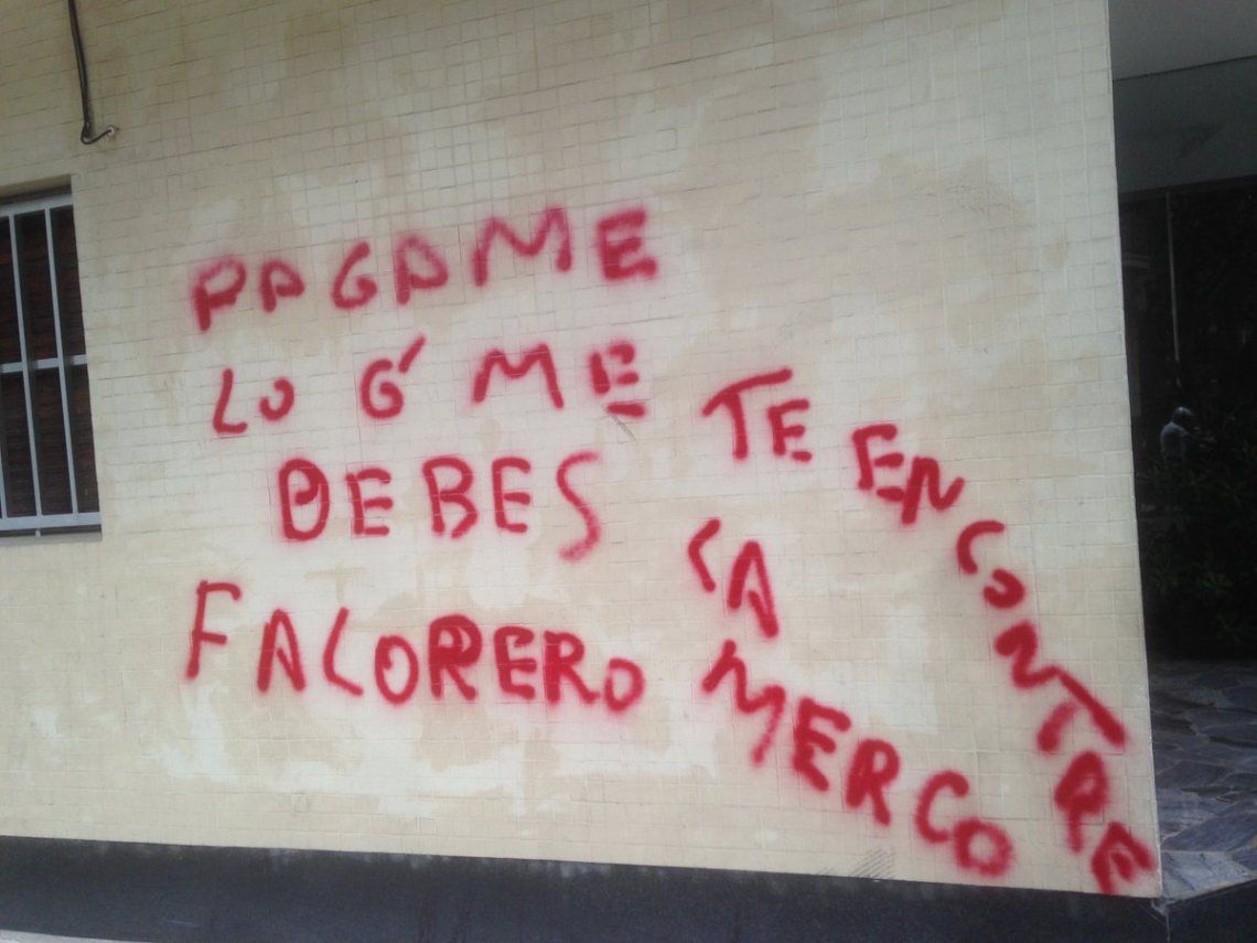 "Pagame la merca, portero falopero", pintaron con aerosol en una de las paredes de la entrada del consorcio, de supuesto nombre Brian, debido a que también se lo deja en claro:"Brian, portero falopero".