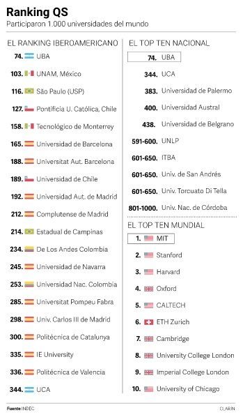 A nivel mundial, las cinco mejores universidades son de Estados Unidos y el Reino Unido: el Massachusetts Institute of Technology (MIT) ocupó el primer puesto, seguido por Stanford, Harvard, Oxford y Caltech. En Iberoamérica, después de la UBA están la UNAM, de México (puesto 103) la de San Pablo (116) y la Católica de Chile (127).