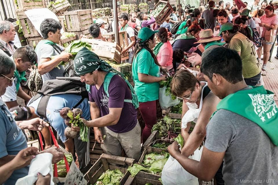 Un grupo de pequeños productores agrícolas nucleados en la Unión de Trabajadores de la Tierra realizan una protesta de tres días frente al Congreso con la entrega de bolsas con cinco kilos de verduras.