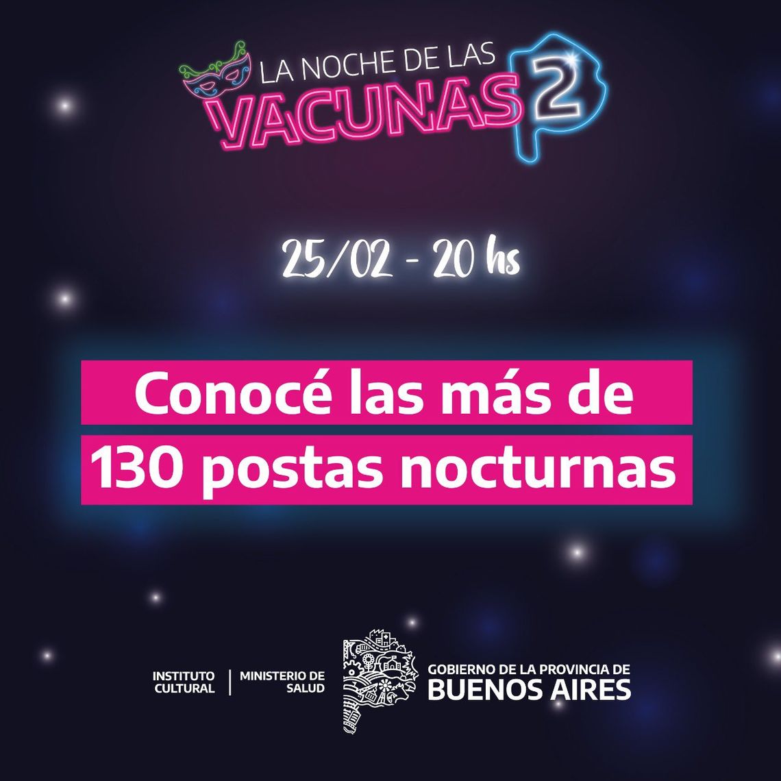 Luego del éxito que tuvo la primera edición desarrollada el pasado 4 de febrero, el Gobierno de la provincia de Buenos Aires confirmó que realizará el próximo viernes 25 una nueva jornada de “La Noche de las Vacunas”.