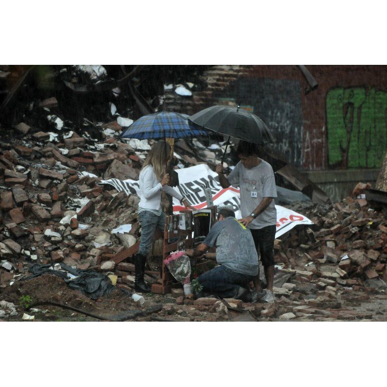 Bajo la lluvia, el homenaje comenzó a las 10 en Azara 1245, lugar en el que a las 9.15 del 5 de febrero pasado se incedió el depósito de documentación de Iron Mountain, con el trágico resultado de diez muertos al caer una pared de más de diez metros de alto.