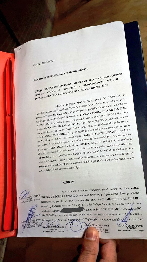 “En cuanto a los médicos, la imputación es la presunta comisión de delito de homicidio cuya víctima fue la menor. Y en cuanto a la defensora, es incumplimiento como funcionaria pública y desobediencia judicial”, detalló el letrado.