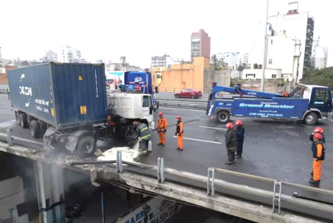 Un camión quedó colgado de la Autopista 25 de Mayo tras sufrir un fuerte choque contra el guardarraíl. Tras un fuerte operativo, se oudo evitar que se caiga al vacío. El conductor, un hombre de 41 años que presentaba 1,65 gramos de alcohol en sangre, pudo ser rescatado ileso por los efectivos de la Policía de la Ciudad y del Sistema de Atención Médica de Emergencia (SAME), que lo trasladaron en “estado de shock” al Hospital Argerich. El hombre quedó detenido por “estrago”.