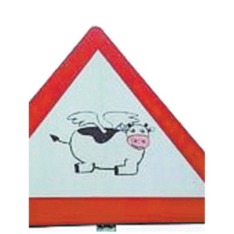 Se trata de una nueva señal de peligro advirtiendo en este caso de la existencia de vacas voladoras. De su autoría nadie sabe nada. Como tampoco se conoce su objetivo o si responden a algún tipo de protesta. Aunque una cosa está clara, no pasan desapercibidas para nadie.