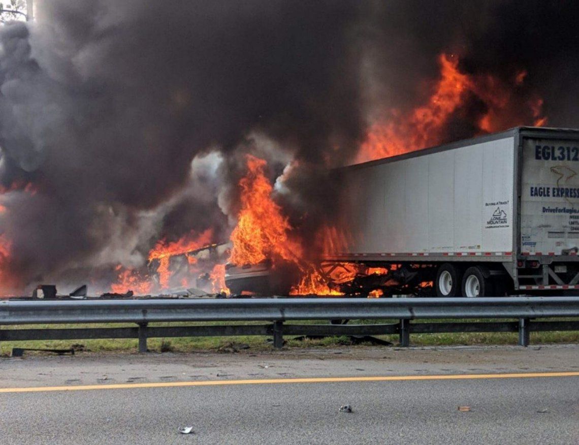 La policía de Florida informó que dos camiones de carga y dos vehículos de pasajeros participaron del siniestro ocurrido en la interestatal 75, un kilómetro y medio al sur de Alachua, cerca de Gainesville, y que el impacto provocó el derrame de 200 litros de combustible sobre la calzada.