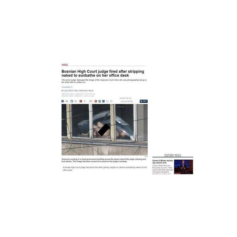 Una jueza fue despedida en Bosnia-Herzegovina tras filtrarse en los medios de comunicación e internet varias fotos en las que aparecía tomando sol en su despacho totalmente desnuda.