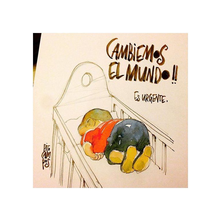 Ante el dolor de esa postal, dibujantes de todo el mundo decidieron en conjunto realizar caricaturas sobre la imagen, para concientizar y reflexionar sobre el drama de los refugiados.