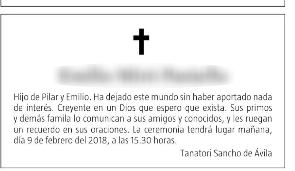 “Hijo de pilar y Emilio. Deja este mundo sin haber aportado nada de interés. Creyente en un Dios que espero que exista. Sus primos y demás familia lo comunican a sus amigos y conocidos, y les ruegan un recuerdo en sus oraciones”, reza, textual, el obituario en su versión en castellano.