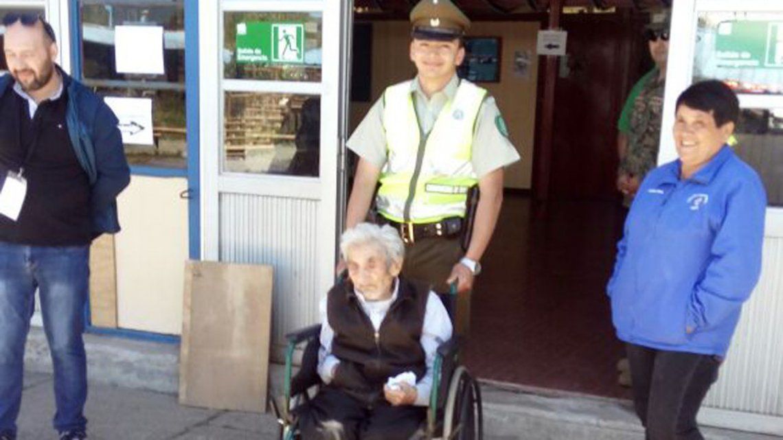 Los carabineros difundieron imágenes en las que se puede ver a un funcionario trasladando al Celino Villanueva en una silla de ruedas hacia la mesa 2 de varones del Liceo Politécnico Pesquero de la localidad de Mehuín.