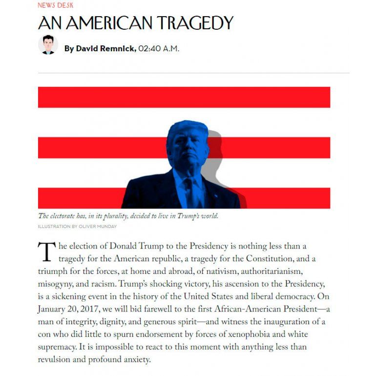 Bajo el título "Una tragedia americana", comienza con lo incisivo, sin tapujos: "La elección como presidente de Donald Trump no es nada menos que una tragedia americana, una tragedia para la Constitución y un triunfo para las fuerzas, nacionales e internacionales, del nativismo, el autoritarismo, la misoginia y el racismo".