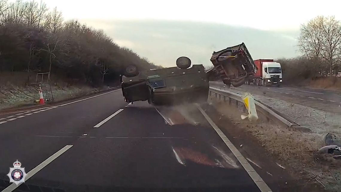 Un impactante accidente ocurrió en una autopista en Inglaterra cuando un auto frenó bruscamente y se cruzó de carril para tomar una salida a último momento, lo que provocó que el jeep militar que iba detrás volcara al tratar de esquivarlo y su conductor saliera despedido a la calzada.