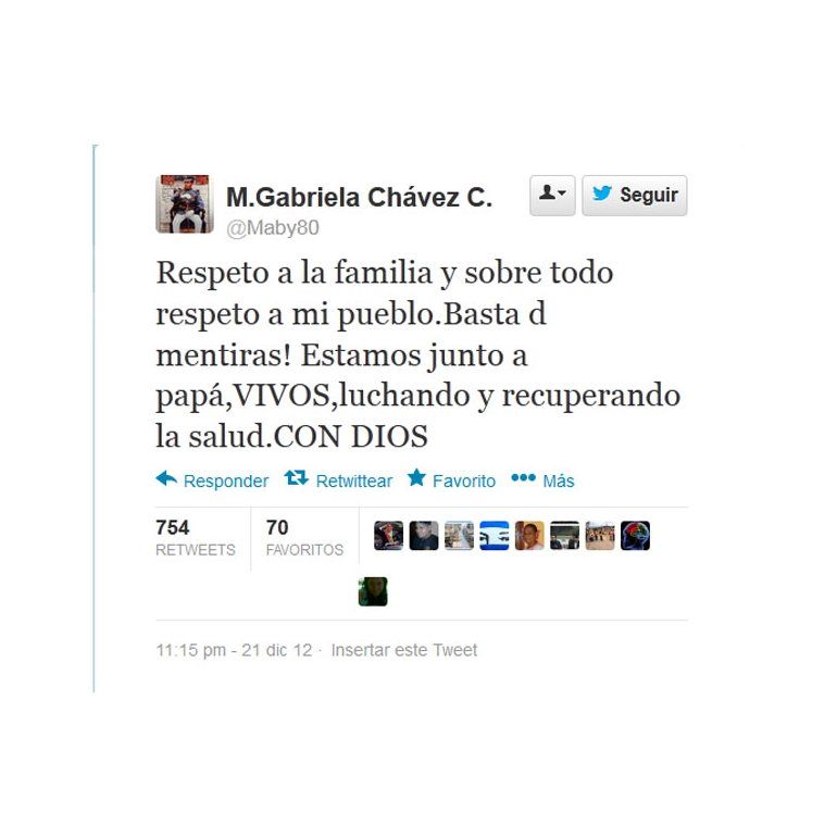 "Respeto a la familia y sobre todo respeto a mi pueblo. Basta d mentiras! Estamos junto a papá. VIVOS, luchando y recuperando la salud. CON DIOS", dijo en su cuenta en Twitter @Maby80 María Gabriela, que se halla en La Habana junto a su padre.