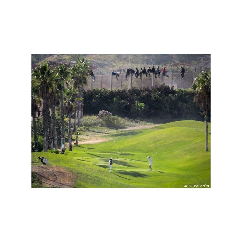 José Palazón, de 59 años, portavoz y presidente de la asociación melillense Prodein, es el autor de la instantánea que muestra cómo en un lado decenas de seres humanos luchan desesperadamente para ingresar a un lugar mejor, mientras que del otro lado, los que ya pertenecen allí juegan al golf impasiblemente.