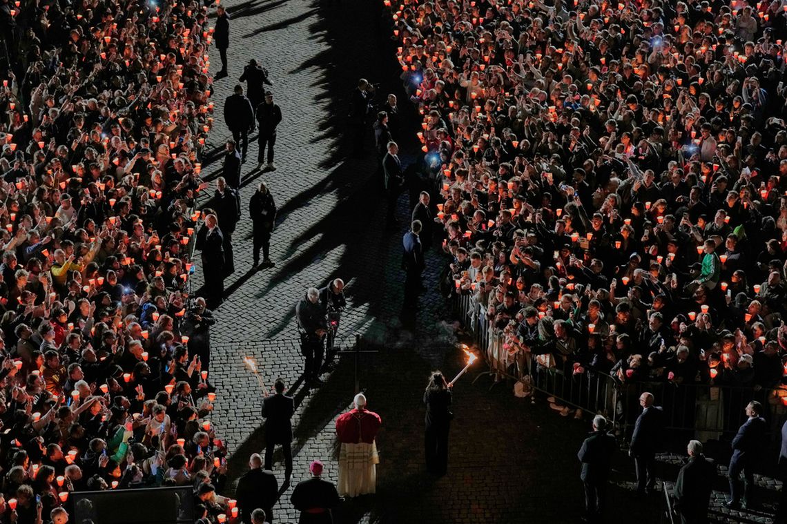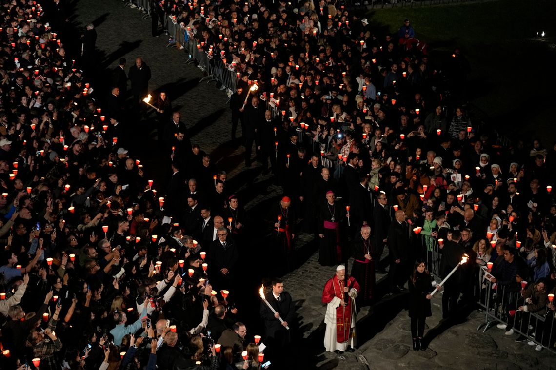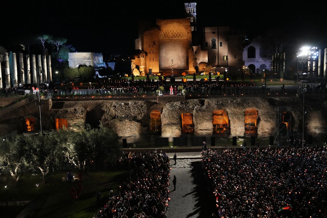 Tras salir del Coliseo, la procesión se dirigió hacia la elevación de los Foros Romanos, donde miles de fieles aguardaban con velas encendidas. El silencio y la solemnidad dominaron la escena, apenas interrumpidos por la lectura de las meditaciones en cada estación. La ceremonia concluyó con el Papa frente a la cruz, desde donde impartió su bendición final.