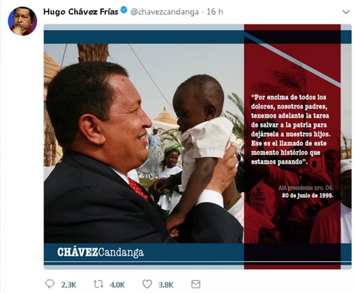 En la cuenta de Twitter del expresidente, desactivada desde su fallecimiento en 2013, aparece una fotografía de Chávez, cargando a un niño junto al siguiente mensaje: “por encima de todos los dolores, nosotros padre, tenemos la tarea de salvar la patria para dejárselas a nuestros hijos. Ese es el llamado del momento histórico que estamos pasando”.