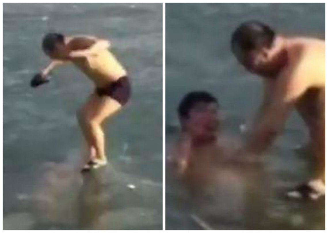 Pero debido a la gran cantidad de hielo acumulado en la superficie, el valiente bañista quedó atrapado y su desesperación se trasladó hacia los testigos de la dramática escena.